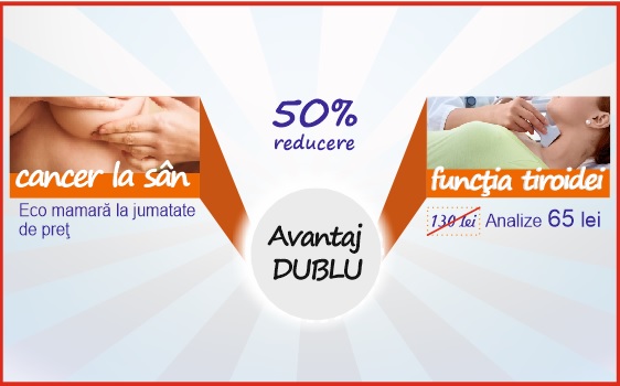 In cadrul campaniei “Avantaj Dublu” fiecare pacient poate beneficia, in 8 judete din tara, de reducere 50% la pachetul de screening la care se adauga 25% reducere pentru orice investigatie suplimentara recomandata de medic. Pentru monitorizarea cancerului la san se ofera ecografie mamara la jumatate de pret, iar pentru afectiunile tiroidiene, pachetul cuprinde analize medicale dedicate la doar 65lei.