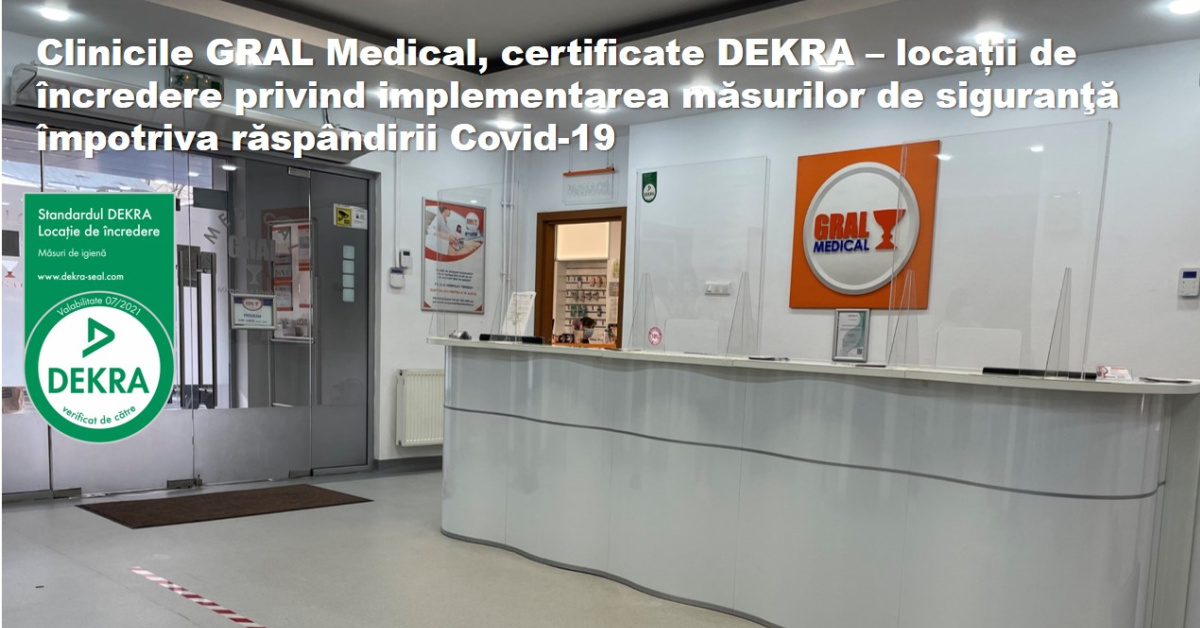 Certificarea DEKRA Trusted Facility atestă Clinicile GRAL Medical ca fiind locații sigure si de încredere pentru pacienţi privind măsurile luate pentru prevenirea infectării cu SARS-CoV-2. Pacienţii noştri pot veni oricând pentru analize, consultaţii sau investigaţii în Clinicile noastre având încredere că sunt implementate măsurile de prevenire şi siguranţă împotriva răspândirii Covid-19 conform standardelor in vigoare.