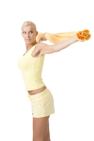 Prindeti in ambele maini un prosop, cordon sau chiar o curea. Apoi, tinand bratele intinse, rotiti-le pe deasupra capului pana in spate, apoi spre fata. Incercati sa micsorati cat mai mult lungimea prosopului cuprinsa intre maini. Acest exercitiu este util pentru indreptarea spatelui, mobilitatea bratelor si ridicarea sanilor.