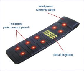 Salteaua dispune de 4 zone distincte de masaj care va vor masa nu mai putin de 9 puncte vitale ale corpului, reusind astfel sa va redea circulatia optima a sangelui, sa va relaxeze si tonifice muschii intregului corp. Dupa doar cateva minute de masaj cu aceasta saltea, va veti simti relaxat, de parca nici nu ati fi avut o zi grea de munca.