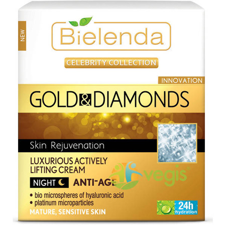 Crema de fata Gold & Diamonds pentru pielea matura si sensibila. Aceasta ofera un efect imediat de netezire a pielii, netezeste ridurile si intinereste pielea fetei. Hidrateaza intensiv, reduce decolorarile de pe fata, restaureaza tonicitatea pielii.