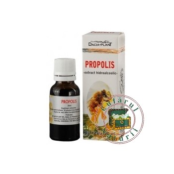 TINCTURA DE PROPOLIS reprezinta extractul alcoolic al propolisului, fiind obtinut prin preparare la rece. Propolisul este obtinut in special din rasina mugurilor de plop, dar si din alte plante, fiind utilizat in medicina traditionala datorita proprietatilor antimicrobiene, antiinflamatoare si cicatrizante. Dintre produsele vegetale si apicole administrate pe cale orala, solutiile alcoolice si hidroalcoolice sunt cel mai usor asimilate de catre organism, efectul aparand la scurt timp.