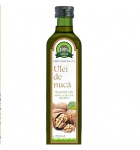 100% ulei natural de nuca presat la rece din miez de nuca uscata natural, netratat termic, foarte bogat in vitamina A, B1, B3, B5, B6, C, D, E, K, precum si minerale: cupru, magneziu, calciu, fosfor, potasiu, fier, acizi grasi, omega3 si omega6. Acizi grasi poli-nesaturati totali 63,3g, din care acid linoleic (omega6) -52,9 g si acid alfa-linoleic 10,4g.