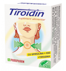 Acest supliment alimentar este destinat persoanelor care sufera de hipotiroidism, acuzand o functionare deficitara a glandei tiroide. Hormonii tiroidieni coordoneaza sistemul hormonal al intregului organism. Secretia deficitara a glandei tiroide se manifesta prin: oboseala cronica, letargie, depresie, incetineala a miscarilor, tulburari de memorie; crestere in greutate, constipatie, toleranta scazuta fata de frig; par, respectiv piele uscata, edem in jurul ochilor, menstruatie abundenta. Hormonii tiroidieni sunt sintetizati dintr-un aminoacid esential denumit L-tirozina si iod. Lipsa acestora conduce la deficit hormonal. Aportul deficitar din alimentatie a acestor „materii prime” conduce la un nivel scazut de hormoni tiroidieni in organism. Spirulina (Spirulina platensis), prin microelemente, acizi grasi esentiali si proteine, stimuleaza functionarea glandei tiroide. Seleniul si vitamina E sunt antioxidanti, care protejeaza tiroida de efectul nociv al radicalilor liberi. Suplimentarea alimentatiei zilnice cu o capsula de TIROIDIN asigura necesarul de nutrienti pentru buna functionare a acestei glande.