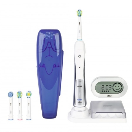 Periuta din imagine prezinta mai multe capete de schimb, specializate pentru periajul zilnic, pentru albirea dintilor, masajul giingiilor, intarirea smaltului si preventia cariilor si a parodontozei. Periuta prezinta un ceas adaptat periajului, cu afisaj si ghidaj si poate fi purtata oriunde!