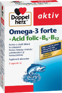 Capsulele Doppelherz® aktiv Omega-3 forte + Acid folic + B6 + B12 contin ulei de somon cu acizi grasi de importanta vitala precum si o combinatie de vitamine esentiale. Puteti suplimenta o dieta alimentara saraca in acizi grasi esentiali cu suplimente nutritive care va ajuta sa sustineti nivelul trigliceridelor si al colesterolului, dar si sa preveniti aparitia afectiunilor cardiovasculare.